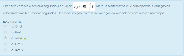Marque a alternativa que corresponde à variação da velocidade nos 6 primeiros segundos. Dado: aceleração é a taxa de variação da velocidade com relação ao tempo.
