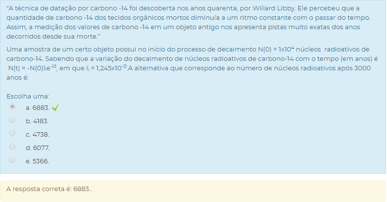Uma amostra de um certo objeto possui no início do processo de decaimento N(0) = 1x104 núcleos radioativos de carbono-14. Sabendo que a variação do decaimento de núcleos radioativos de carbono-14 com o tempo (em anos) é N(t) = -N(0)λe-λt, em que λ = 1,245x10-0.A alternativa que corresponde ao número de núcleos radioativos após 3000 anos é: