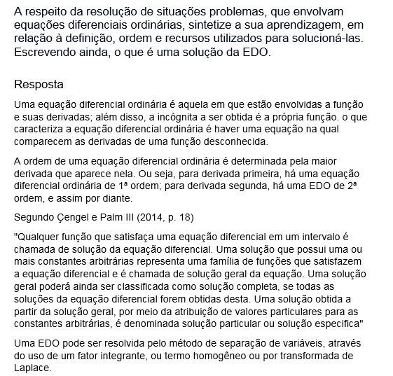 A respeito da resolução de situações problemas, que envolvam equações diferenciais ordinárias, sintetize a sua aprendizagem, em relação à definição, ordem e recursos utilizados para solucioná-las. Escrevendo ainda, o que é uma solução da EDO.