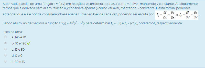 Sendo assim, ao derivarmos a função z(x,y) = 4x2y3 + x2y para determinar fx = (1,1) e fy = (-2,2), obteremos, respectivamente:
