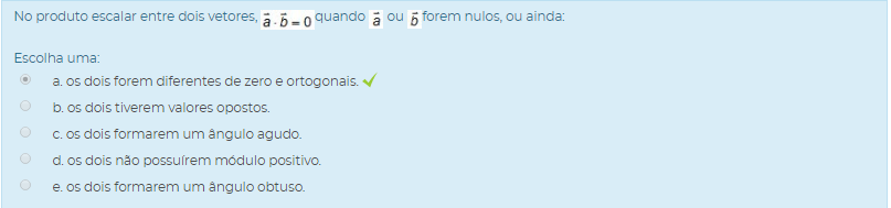 Para que o produto escalar entre dois vetores seja nulo, os dois precisam ser ortogonais, diferentes de zero ou:
