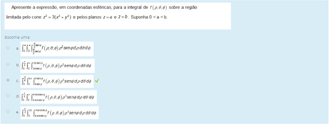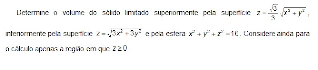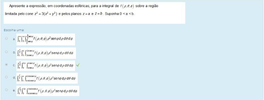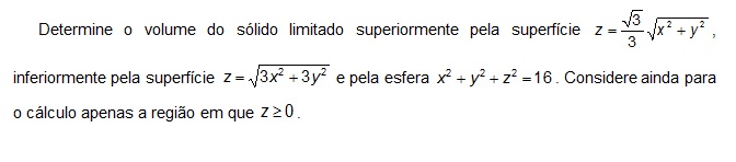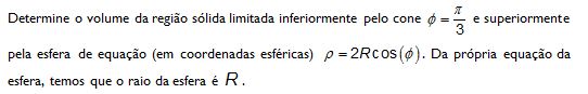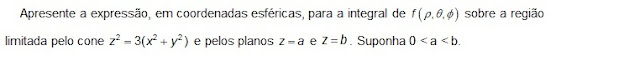 1) Apresente a expressão, em coordenadas esféricas, para a integral de f (p,teta,0) sobre a região limitada pelo cone Z^2 = 3(x^2+y^2) e pelos pianos z = a e z = b. Suponha 0 < a < b.