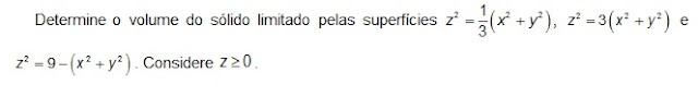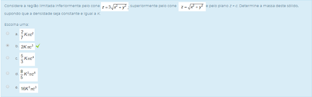 1) Considere a região limitada inferiormente pelo cone z=3raizx²+y², superiormente pelo cone z=raiz x²+y²e pelo plano z = c. Determine a massa deste sólido, supondo que a densidade seja constante e igual a K.