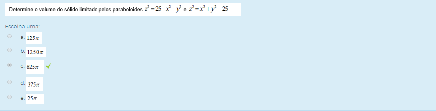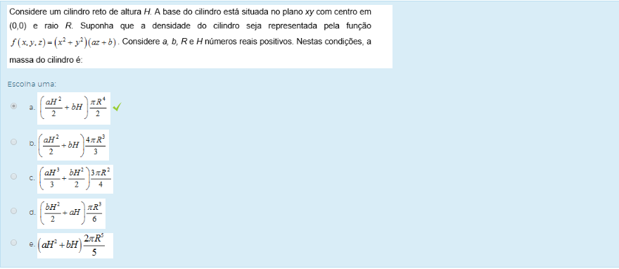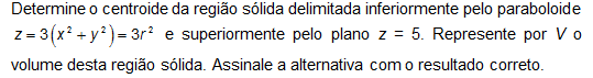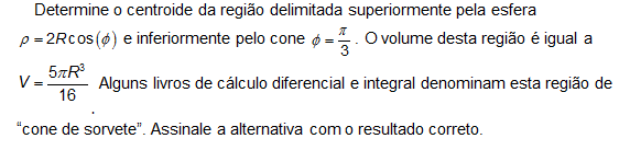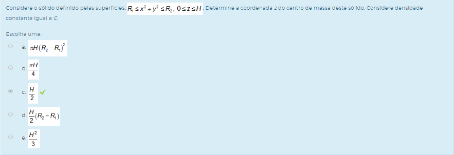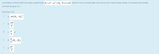 . Determine a coordenada z do centro de massa deste sólido. Considere densidade constante igual a C. Escolha uma: