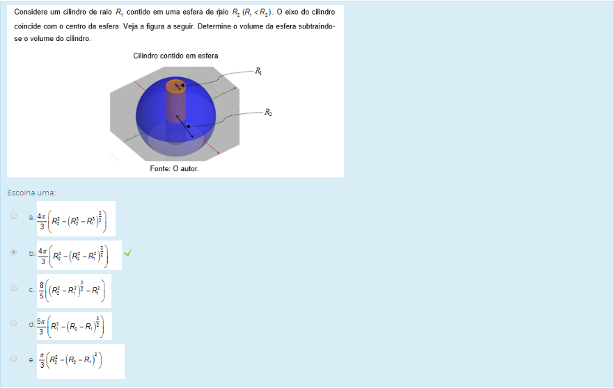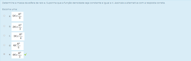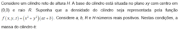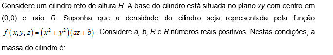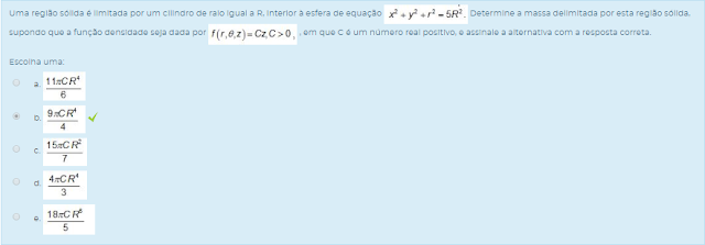 2) Uma região sólida é limitada por um cilindro de raio igual a R, interior à esfera de equação x²+y²+r²=5R² Determine a massa delimitada por esta região sólida, supondo que a função densidade seja dada por f(R,0,Z)=Cz,C>0 , em que C é um número real positivo, e assinale a alternativa com a resposta correta.
