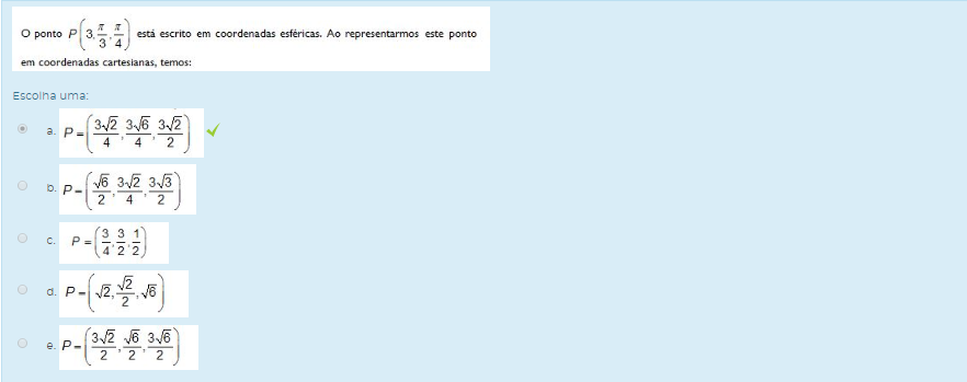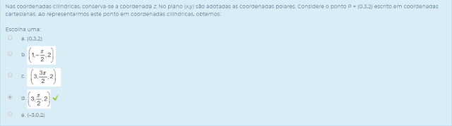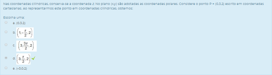 3) Nas coordenadas cilíndricas, conserva-se a coordenada z. No plano (x,y) são adotadas as coordenadas polares. Considere o ponto P = (0,3,2) escrito em coordenadas cartesianas. Ao representarmos este ponto em coordenadas cilíndricas, obtemos: