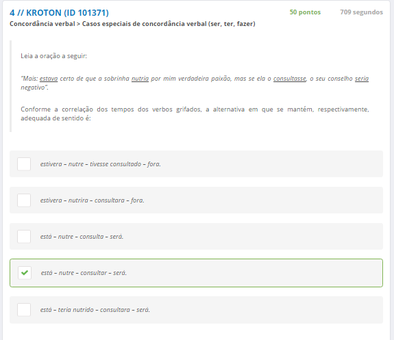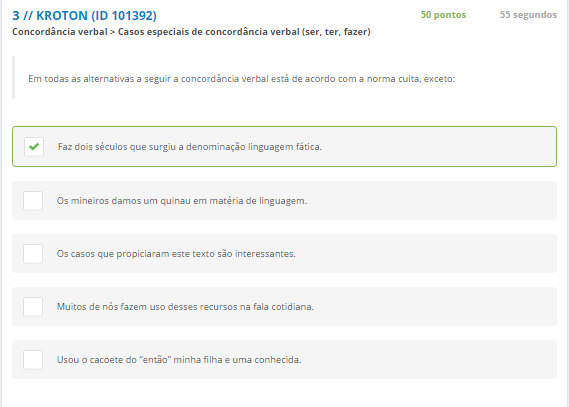 2 Assinale a alternativa correta a respeito da frase “Eu sei onde tem doces”, que aparece no segundo quadro. Escolha uma: a. Qualquer uma das duas frases está correta: “Eu sei onde tem doces.” ou “Eu sei onde há doces.”. b. Essa frase apresenta um erro ao utilizar o verbo “ter” com sentido de “existir”. Essa utilização é considerada coloquial. A utilização correta, segundo a norma culta, seria:
