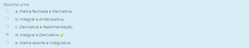 e. A ação integral reajusta o Set Point de forma a eliminar o erro de off-set, atua no processo enquanto a diferença entre o valor desejado e o valor mensurado persistir.