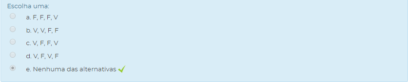 Assumindo V para verdadeiro e F para falso, assinale a alternativa que corresponda a sequência correta.