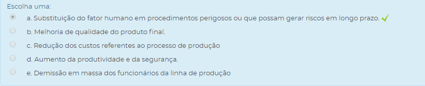 a. Substituição do fator humano em procedimentos perigosos ou que possam gerar riscos em longo prazo.