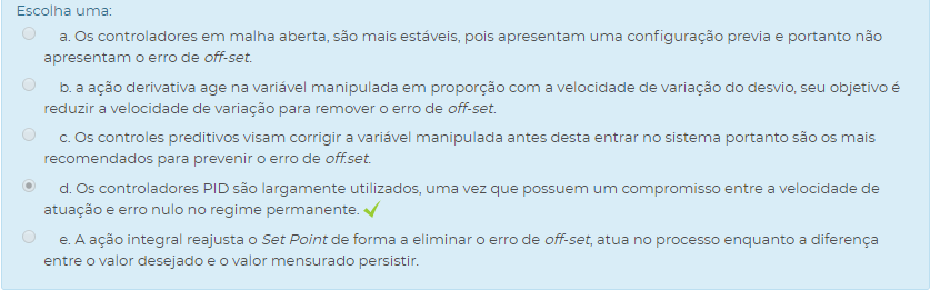 d. Os controladores PID são largamente utilizados, uma vez que possuem um compromisso entre a velocidade de atuação e erro nulo no regime permanente.