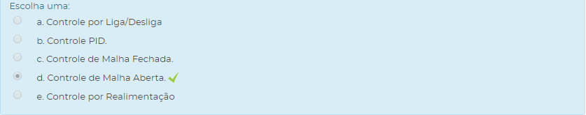 3) A técnica de controle de ação liga/desliga como o próprio nome sugere, visa um algoritmo de controle em que a variável de entrada é corrigida ao ligar ou desligar um processo para adequar a variável manipulada ao valor desejado (Set Point).