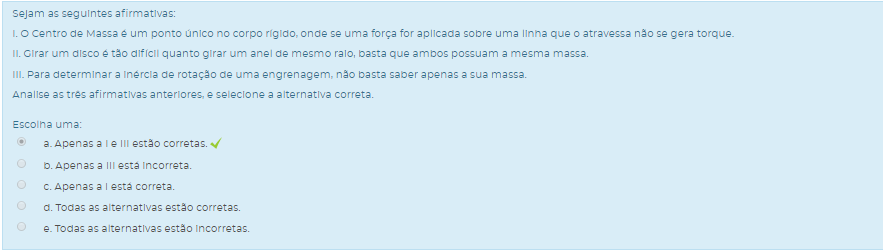 III. Para determinar a inércia de rotação de uma engrenagem, não basta saber apenas a sua massa.