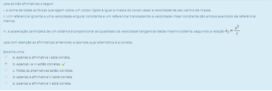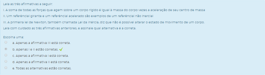 I. A soma de todas as forças que agem sobre um corpo rígido é igual à massa do corpo vezes a velocidade de seu centro de massa.