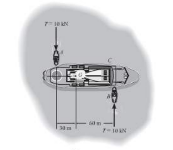 e seu centro de gravidade está localizado em G. Dois rebocadores de peso desprezível são usados para virá-lo, cada um com uma força de 10 KN. Considere que o navio tem um raio de giro em relação ao seu centro de gravidade de 37.5 M . Um rebocador esta distante em 30m do centro de massa do navio, o segundo está a 60m do centro de massa. Despreze a resistência da água.
