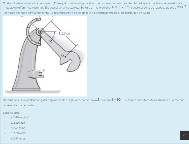 1) O pêndulo de um máquina de impacto Charpy, ilustrado na figura abaixo, é um equipamento muito utilizado para medidas de resistência a impacto de diferentes materiais. Ele possui uma massa total 50 kg e um raio de giro K=1,75 m e deve ser solto do repouso quando O=0º (pêndulo alinhado com a horizontal). A distância entre o eixo de giro e o centro de massa G do pêndulo é de 1,25m.
