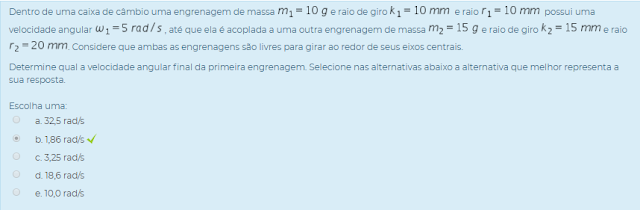 Determine qual a velocidade angular final da primeira engrenagem. Selecione nas alternativas abaixo a alternativa que melhor representa a sua resposta.