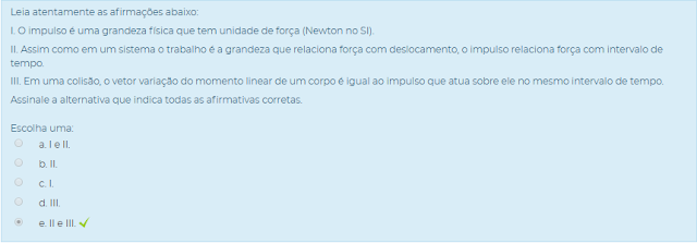 III. Em uma colisão, o vetor variação do momento linear de um corpo é igual ao impulso que atua sobre ele no mesmo intervalo de tempo.