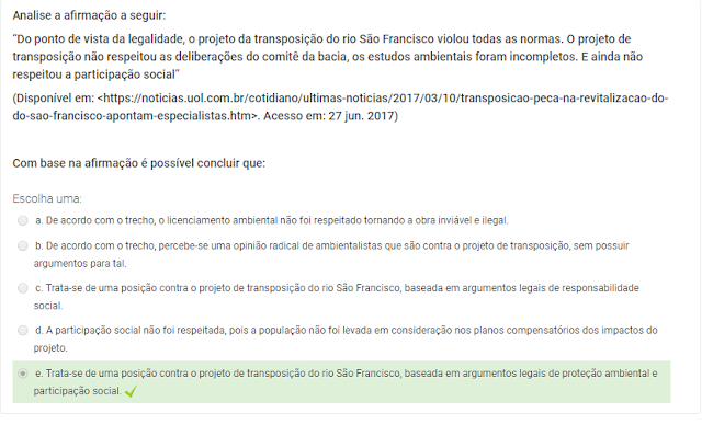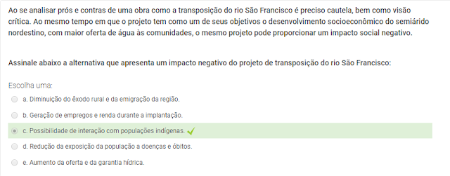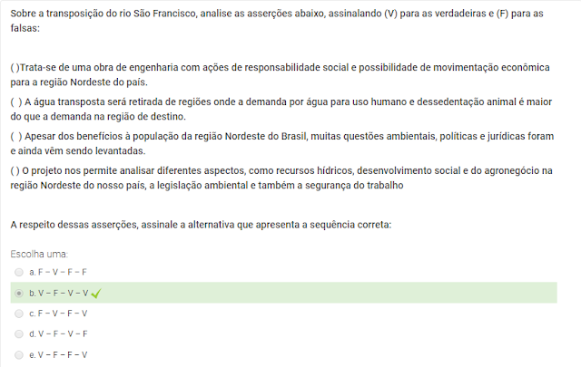 ( ) O projeto nos permite analisar diferentes aspectos, como recursos hídricos, desenvolvimento social e do agronegócio na região Nordeste do nosso país, a legislação ambiental e também a segurança do trabalho