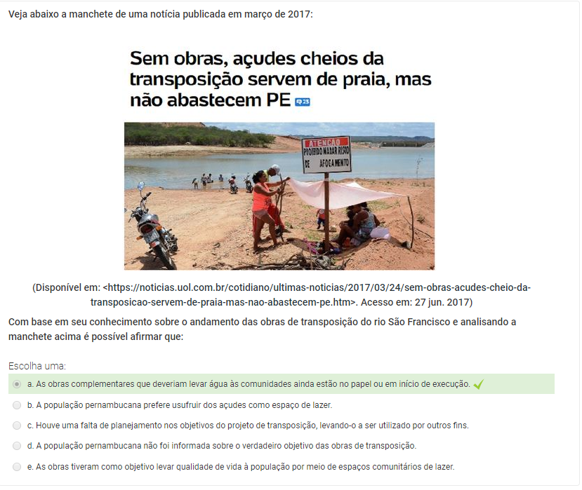 (Disponível em: <https://noticias.uol.com.br/cotidiano/ultimas-noticias/2017/03/24/sem-obras-acudes-cheio-da-transposicao-servem-de-praia-mas-nao-abastecem-pe.htm>. Acesso em: 27 jun. 2017)