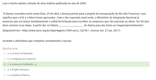 “O Ibama concedeu nesta sexta-feira, 29 de abril, a licença prévia para o projeto de transposição do Rio São Francisco. Isso significa que o EIA e o Rima foram aprovados. Com o tão esperado sinal verde, o Ministério da Integração Nacional já anunciou que vai lançar imediatamente o edital de licitação para escolher as empresas que vão executar as obras. Em 45 dias deve concluir essa etapa. A partir daí, só faltará _____________________ do Ibama para dar início ao megaempreendimento.”