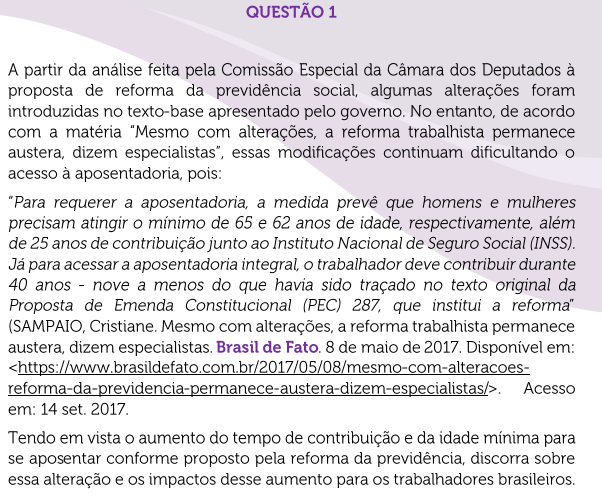 Resposta: O governo buscou aumentar a receita através do alongamento do tempo de contribuição para 40 anos e também da idade mínima para se aposentar, alterando para 65 (homens) e 62 anos (mulheres), ou seja, tenta fazer com que o trabalhador permaneça ativo por mais tempo e depois goze por menos tempo a aposentadoria.