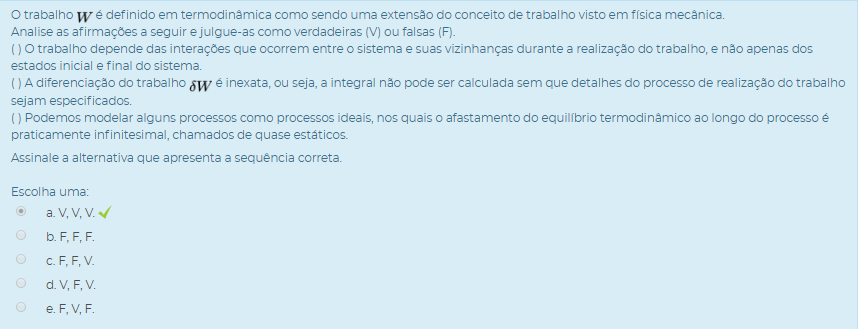 ( ) O trabalho depende das interações que ocorrem entre o sistema e suas vizinhanças durante a realização do trabalho, e não apenas dos estados inicial e final do sistema.