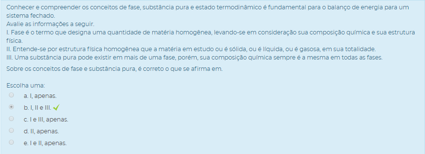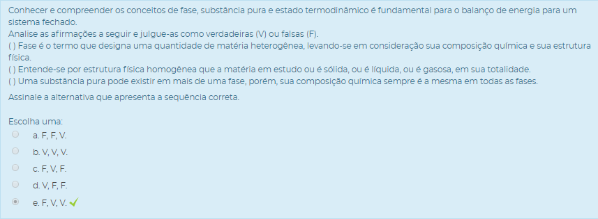 1) Conhecer e compreender os conceitos de fase, substância pura e estado termodinâmico é fundamental para o balanço de energia para um sistema fechado.