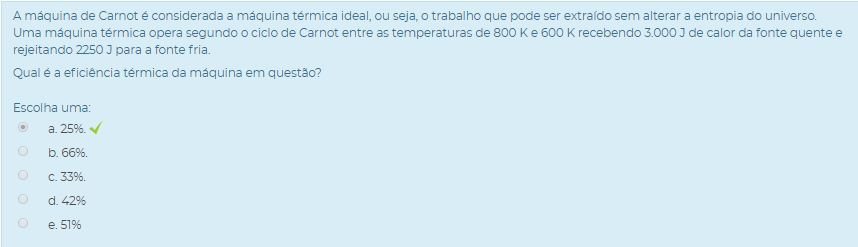 Uma máquina térmica opera segundo o ciclo de Carnot entre as temperaturas de 800 K e 600 K recebendo 3.000 J de calor da fonte quente e rejeitando 2250 J para a fonte fria.