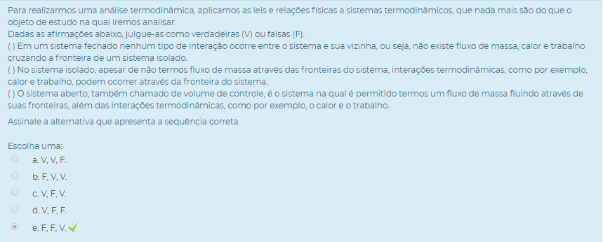 ( ) No sistema isolado, apesar de não termos fluxo de massa através das fronteiras do sistema, interações termodinâmicas, como por exemplo, calor e trabalho, podem ocorrer através da fronteira do sistema.