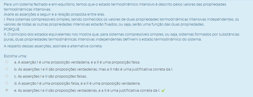 II. O princípio dos estados equivalentes nos mostra que, para sistemas compressíveis simples, ou seja, sistemas formados por substâncias puras, duas propriedades termodinâmicas intensivas independentes definem o estado termodinâmico do sistema.