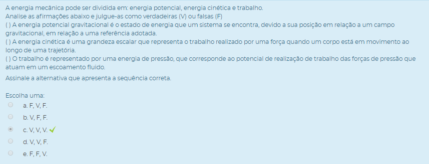 ( ) O trabalho é representado por uma energia de pressão, que corresponde ao potencial de realização de trabalho das forças de pressão que atuam em um escoamento fluido.