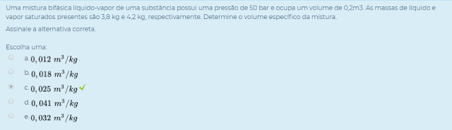 1) Uma mistura bifásica líquido-vapor de uma substância possui uma pressão de 50 bar e ocupa um volume de 0,2m3. As massas de líquido e vapor saturados presentes são 3,8 kg e 4,2 kg, respectivamente. Determine o volume específico da mistura.