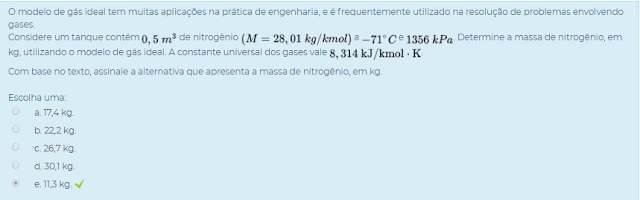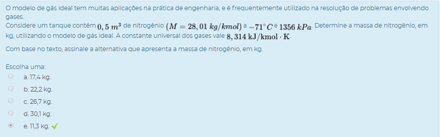 Considere um tanque contém 0,5 m³ de nitrogênio (M=28,1 Kg/Kmol) a -71ºC e 1356KPa . Determine a massa de nitrogênio, em kg, utilizando o modelo de gás ideal. A constante universal dos gases vale 8,314 Kj/Kmol . K.