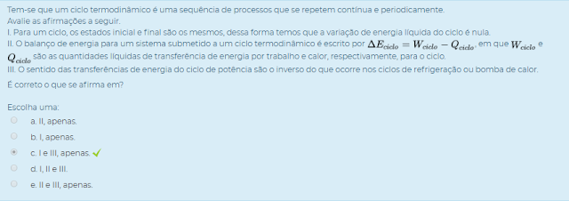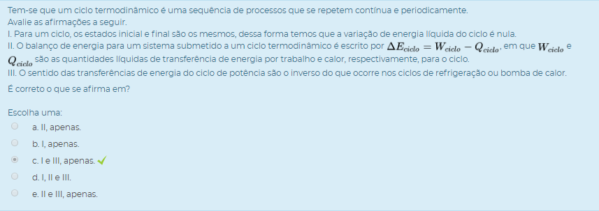 I. Para um ciclo, os estados inicial e final são os mesmos, dessa forma temos que a variação de energia líquida do ciclo é nula.