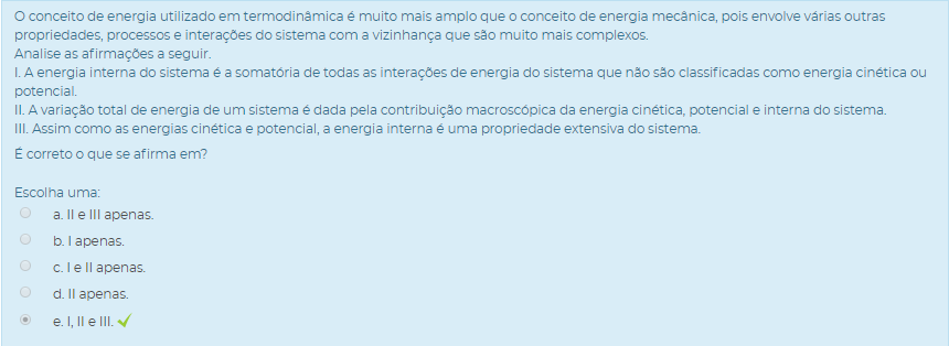 III. Assim como as energias cinética e potencial, a energia interna é uma propriedade extensiva do sistema.