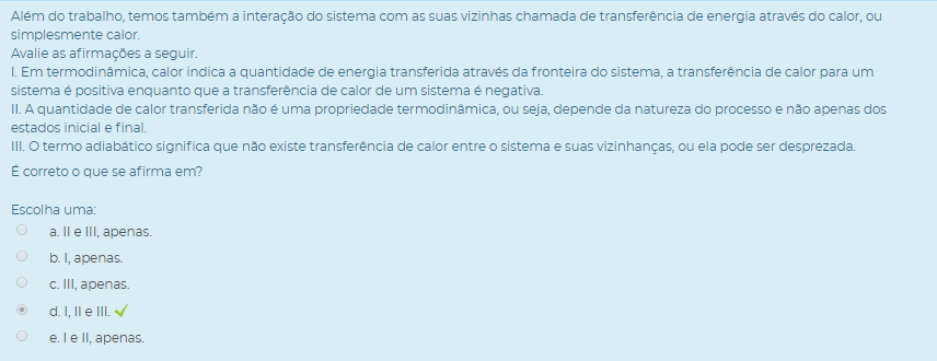 III. O termo adiabático significa que não existe transferência de calor entre o sistema e suas vizinhanças, ou ela pode ser desprezada.