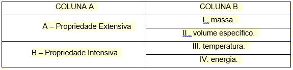 1) As propriedades termodinâmicas podem ser classificadas como: propriedades extensivas e propriedades intensivas. Com relações as propriedades termodinâmicas associem as informações das colunas A e B.