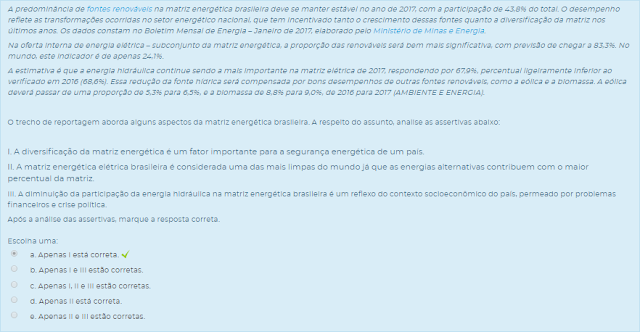 O trecho de reportagem aborda alguns aspectos da matriz energética brasileira. A respeito do assunto, analise as assertivas abaixo: