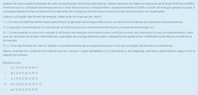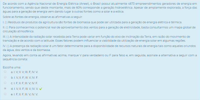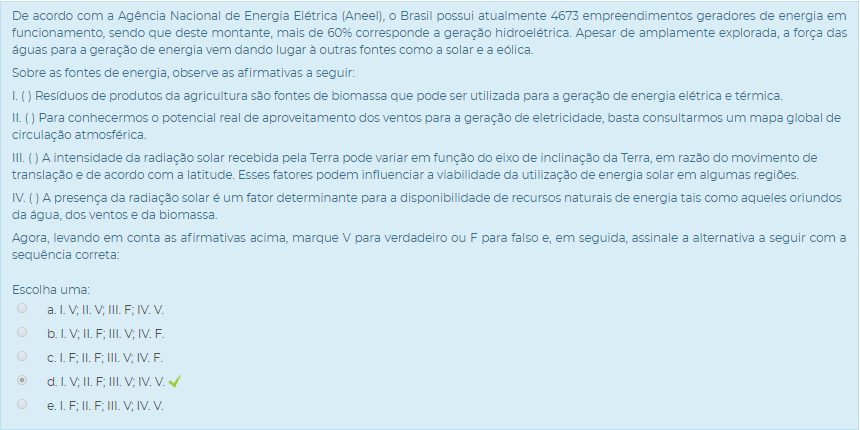 IV. ( ) A presença da radiação solar é um fator determinante para a disponibilidade de recursos naturais de energia tais como aqueles oriundos da água, dos ventos e da biomassa.