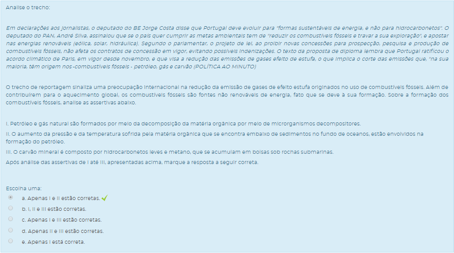 O trecho de reportagem sinaliza uma preocupação internacional na redução da emissão de gases de efeito estufa originados no uso de combustíveis fósseis. Além de contribuírem para o aquecimento global, os combustíveis fósseis são fontes não renováveis de energia, fato que se deve à sua formação. Sobre a formação dos combustíveis fósseis, analise as assertivas abaixo.