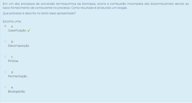 1) Em um dos processos de conversão termoquímica da biomassa, ocorre a combustão incompleta dos biocombustíveis devido ao baixo fornecimento de comburente no processo. Como resultado é produzido um biogás.