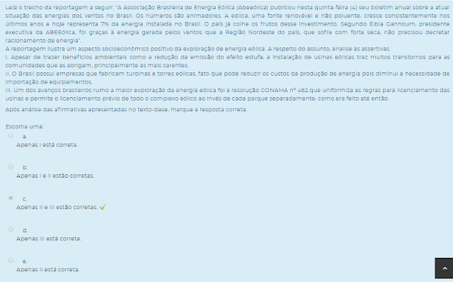 1) Leia o trecho da reportagem a seguir: “A Associação Brasileira de Energia Eólica (Abeeólica) publicou nesta quinta-feira (4) seu boletim anual sobre a atual situação das energias dos ventos no Brasil. Os números são animadores. A eólica, uma fonte renovável e não poluente, cresce consistentemente nos últimos anos e hoje representa 7% da energia instalada no Brasil. O país já colhe os frutos desse investimento. Segundo Elbia Gannoum, presidente executiva da ABEEólica, foi graças à energia gerada pelos ventos que a Região Nordeste do país, que sofre com forte seca, não precisou decretar racionamento de energia”.