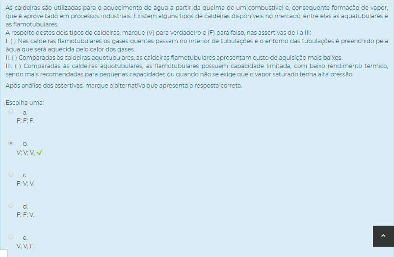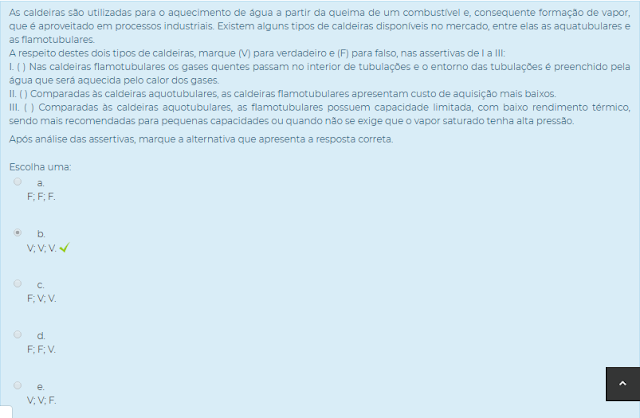 A respeito destes dois tipos de caldeiras, marque (V) para verdadeiro e (F) para falso, nas assertivas de I a III: