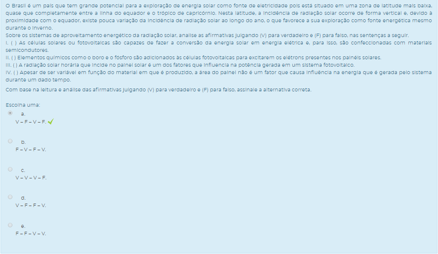 I. ( ) As células solares ou fotovoltaicas são capazes de fazer a conversão da energia solar em energia elétrica e, para isso, são confeccionadas com materiais semicondutores.