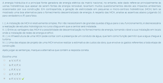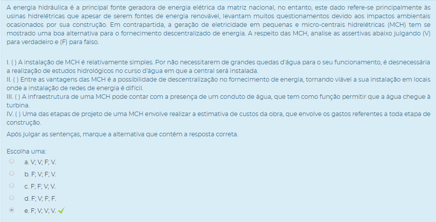 III. ( ) A infraestrutura de uma MCH pode contar com a presença de um conduto de água, que tem como função permitir que a água chegue à turbina.