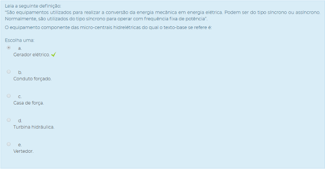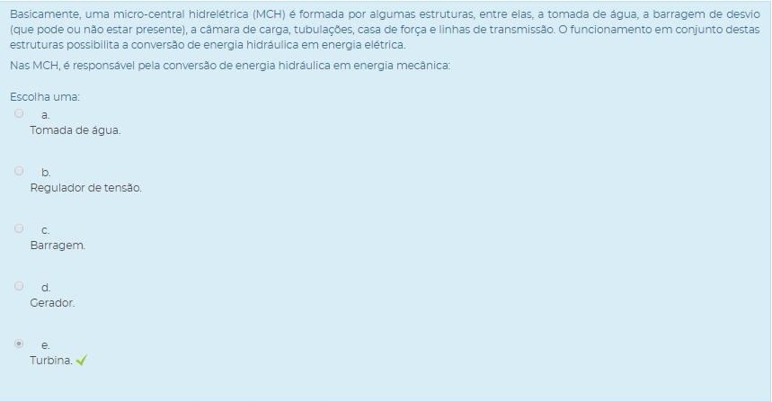 1) A geração de energia elétrica nas micro-centrais hidrelétricas (MCH) respeita os mesmos princípios das grandes usinas. Analise as assertivas a seguir, colocando-a na ordem em que a energia é gerada:
