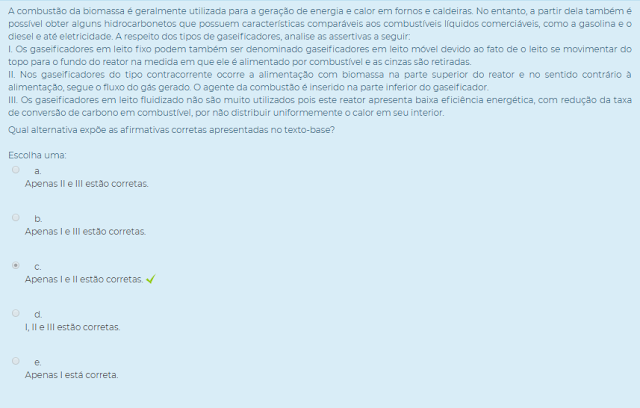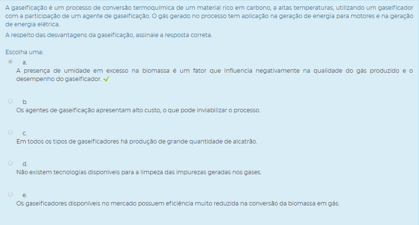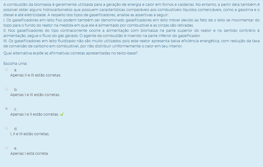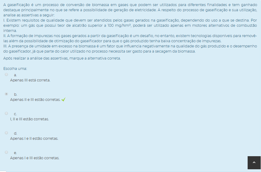 III. A presença de umidade em excesso na biomassa é um fator que influencia negativamente na qualidade do gás produzido e o desempenho do gaseificador, já que parte do calor utilizado no processo necessita ser gasto para a secagem da biomassa.
