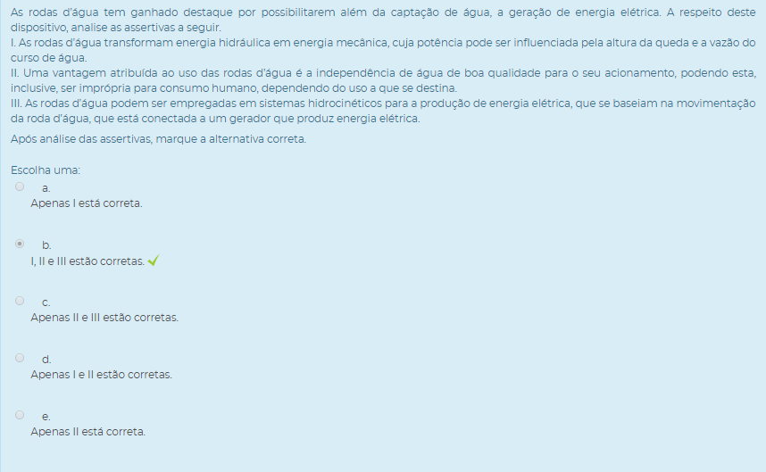 III. As rodas d’água podem ser empregadas em sistemas hidrocinéticos para a produção de energia elétrica, que se baseiam na movimentação da roda d’água, que está conectada a um gerador que produz energia elétrica.