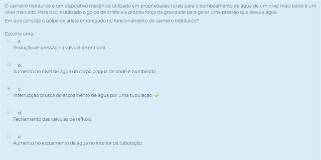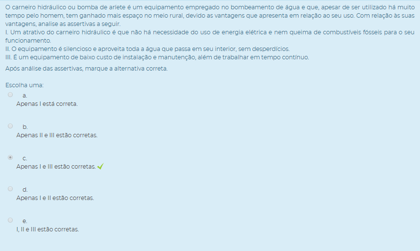 1) O carneiro hidráulico ou bomba de aríete é um equipamento empregado no bombeamento de água e que, apesar de ser utilizado há muito tempo pelo homem, tem ganhado mais espaço no meio rural, devido as vantagens que apresenta em relação ao seu uso. Com relação às suas vantagens, analise as assertivas a seguir.